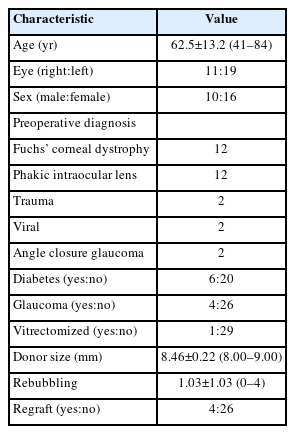 2023년 1월부터 2025년 6월까지 총 35명(39안)에서 삼중 DMEK 수술이 시행된 것으로 확인되었으나 9안은 연구에 포함되지 않았는데 2안은 이식편 일차 실패였으며, 7안은 수술 후 90일 이상 관찰되지 않았거나 추적관찰 중 검사가 충분히 포함되지 않았다. 대상안에 대한 기본데이터는 Table 1에 정리하였다. 대상자들의 평균 관찰 기간은 437±263일이었으며 남녀 비율은 10:16으로 여성이 많았다.