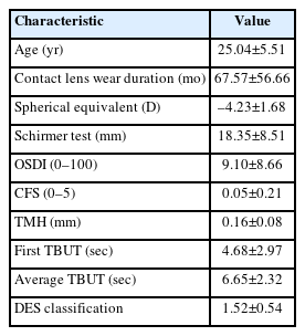 유효성 평가에 적합한 대상 250명은 남자 142명, 여자 108명으로, 이들의 평균 나이는 25.04±5.51세였다. 전체 환자 중 렌즈 착용 기간에 대한 응답자는 88명이었으며 이들의 평균 렌즈 착용 기간은 67.57±56.66개월(범위, 6‒324개월)이었다. 전체 환자의 건성안 관련 지표 결과는 Table 1에 정리하였다.