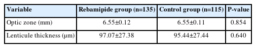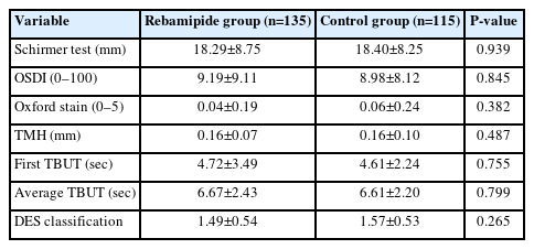 전체 대상자의 의무기록을 분석한 결과, 레바미피드군은 135명, 대조군은 115명이었다. 평균 연령은 레바미피드군과 대조군이 각각 24.65±5.26세와 25.59±6.15세(P=0.231, unpaired t-test)였고 남녀비율은 각각 71:64명, 70:45명이었다(P=0.188, chi-square test). 렌즈 착용 기간은 레바미피드군은 70.79±60.65개월(n=48), 대조군에서는 63.70±51.95개월(n=40)이었다(P=0.562, unpaired t-test). 두 군 간의 나이와 성별, 렌즈 착용 기간은 통계적으로 유의한 차이는 없었다. 각 군의 술 전 건성안 관련 지표는 Table 2와 같고 두 군에서 유의한 차이를 보이는 지표는 없었다.