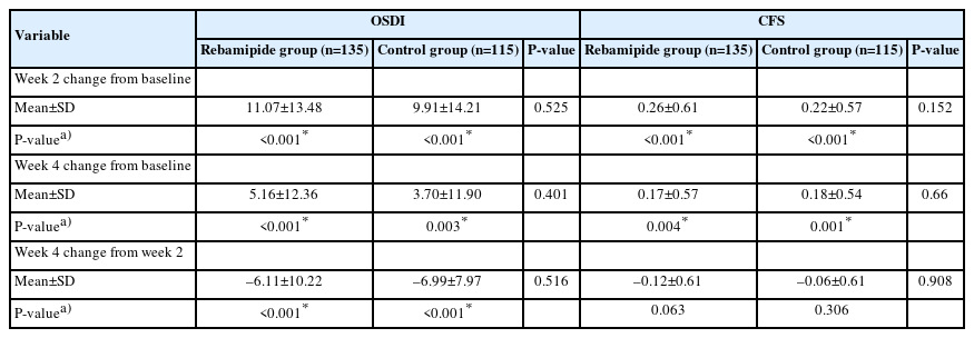 CFS는 술 전, 술 후 2주, 술 후 4주에 두 군 간의 유의한 차이는 없었다. 레바미피드군의 경우 술 전 0.04±0.19, 술 후 2주 0.30±0.58 (술 전 대비 변화 P<0.001), 술 후 4주 0.22±0.51 (술 전 대비 P=0.004, 술 후 2주 대비 P=0.063)로 변화하였으며, 대조군의 경우 술 전 0.06±0.24, 술 후 2주 0.29±0.53 (술 전 대비 변화 P<0.001), 술 후 4주 0.24±0.52 (술 전 대비 변화 P=0.001, 술 후 2주 대비 P=0.306)로 두 군 모두 술 전 대비 술 후 2주와 4주에 통계적으로 유의하게 CFS가 증가하였고, 두 군 모두 술 후 2주에 비해 술 후 4주에는 감소하였으나 통계적으로 유의하지는 않았다. 시기별 CFS 변화량에 대해서도 두 군 간의 유의한 차이는 없었다(Table 3, Fig. 1B).