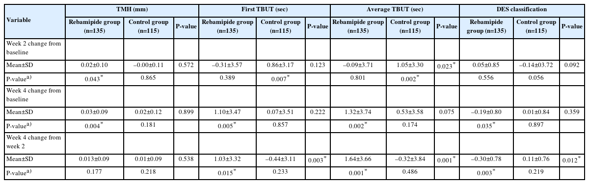 Table 4.Comparison of changes over time in the TMH, first TBUT, average TBUT, and DES classification by K5M between the rebamipide and control groups