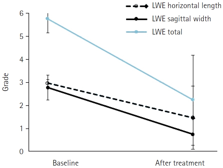 The mean patient age was 37.58±12.35 years (range, 21–67 years); six patients were male and 27 were female. At baseline, the mean VAS symptom score was 7.18±1.47, and the mean TBUT was 2.78±0.78 seconds. After 2 weeks of treatment, the mean VAS score decreased to 4.87±1.97, and the mean TBUT increased to 3.68±1.08 seconds (both P<0.05). The mean corneal staining score was 1.09±1.50, and the mean LWE grade was 5.76±0.61 at baseline. Following treatment, these values decreased to 0.55±0.83 and 2.24±1.95, respectively (both P<0.05). Among the objective parameters, only the LWE grade showed a significant correlation with the VAS score.