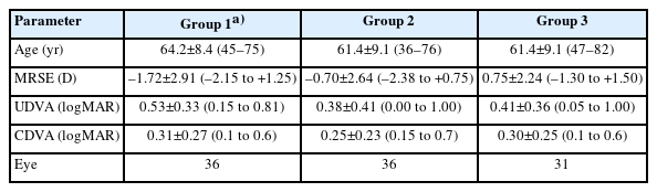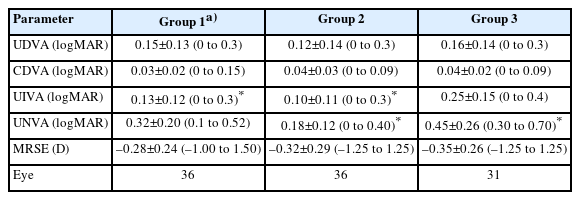 수술 전 데이터를 비교한 결과, 나이, 구면굴절 대응치, 원거리 나안시력, 원거리 교정시력은 세 군 간 통계적으로 유의한 차이가 없었다(P>0.05) (Table 1).