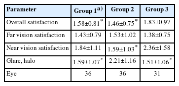 세 군 간에 원거리 시력 만족도에는 유의미한 차이가 없었다(P>0.05). 그러나 근거리 시력 만족도는 2군(1.59±1.03)이 1군(1.84±1.11)과 3군(2.36±1.58)보다 유의하게 좋았다(P<0.05). 눈부심과 빛 번짐에 대한 만족도는 1군(1.59±1.07)과 3군(1.51±1.06)이 2군(2.21±1.16)보다 유의하게 좋았다(P<0.05). 전체적인 시력의 만족도는 1군(1.58±0.81)과 2군(1.46±0.75)이 3군(1.83±0.97)보다 유의하게 좋았다(P<0.05) (Table 3).